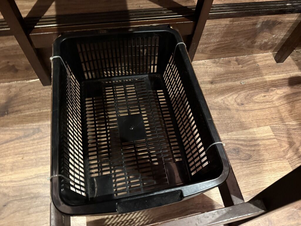 店内は厨房前に真っ直ぐなカウンター4席、2人卓x3。椅子下に荷物かごがセットされています。紙エプロンは申告制。