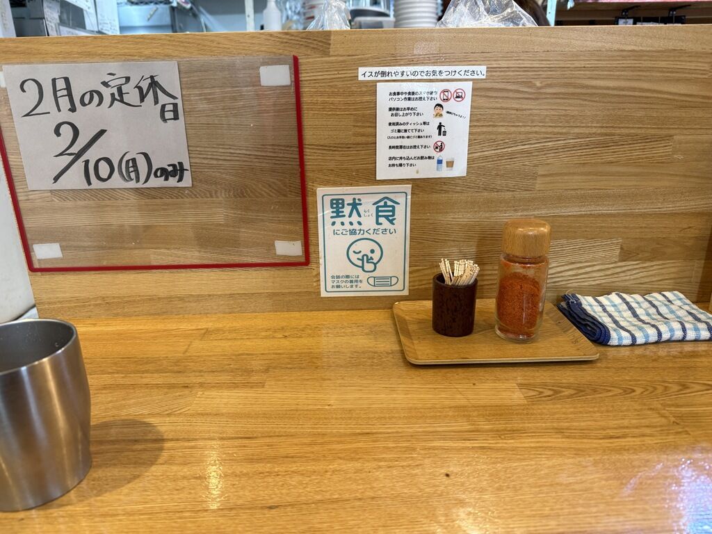BGMはJ-POP、亜麻色の髪の乙女、Wait & See~リスク~、世界が終わるまでは、他♪箸は洗い箸でサスティナブルに配慮。卓上調味料は一味唐辛子。