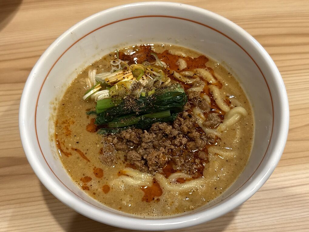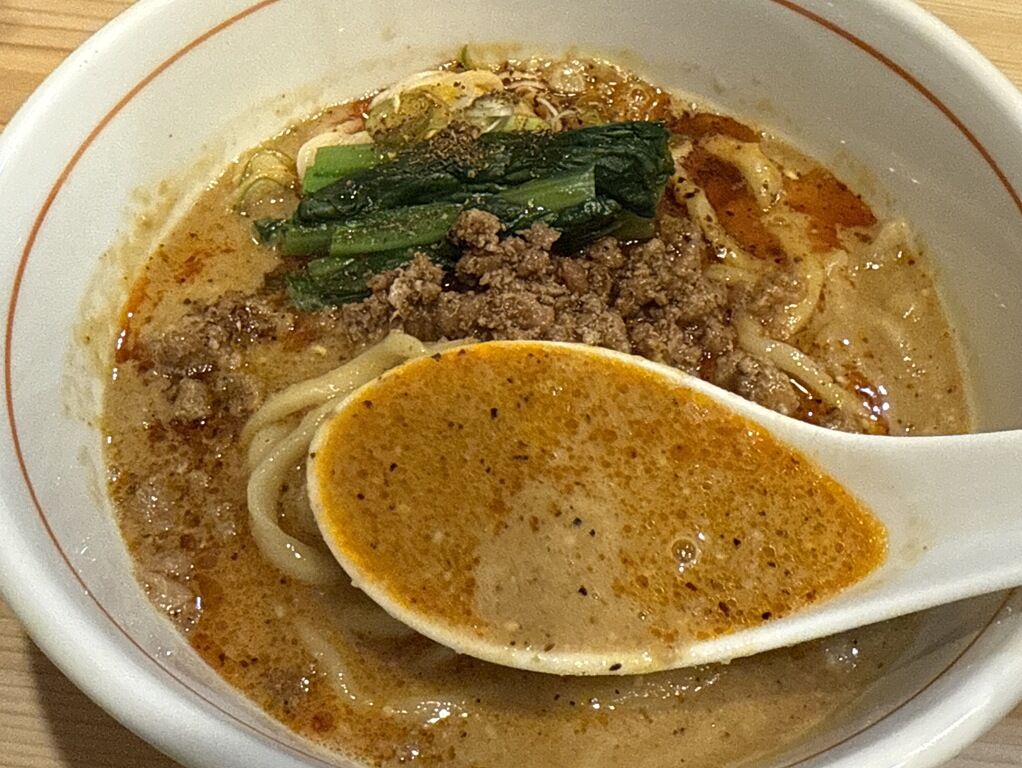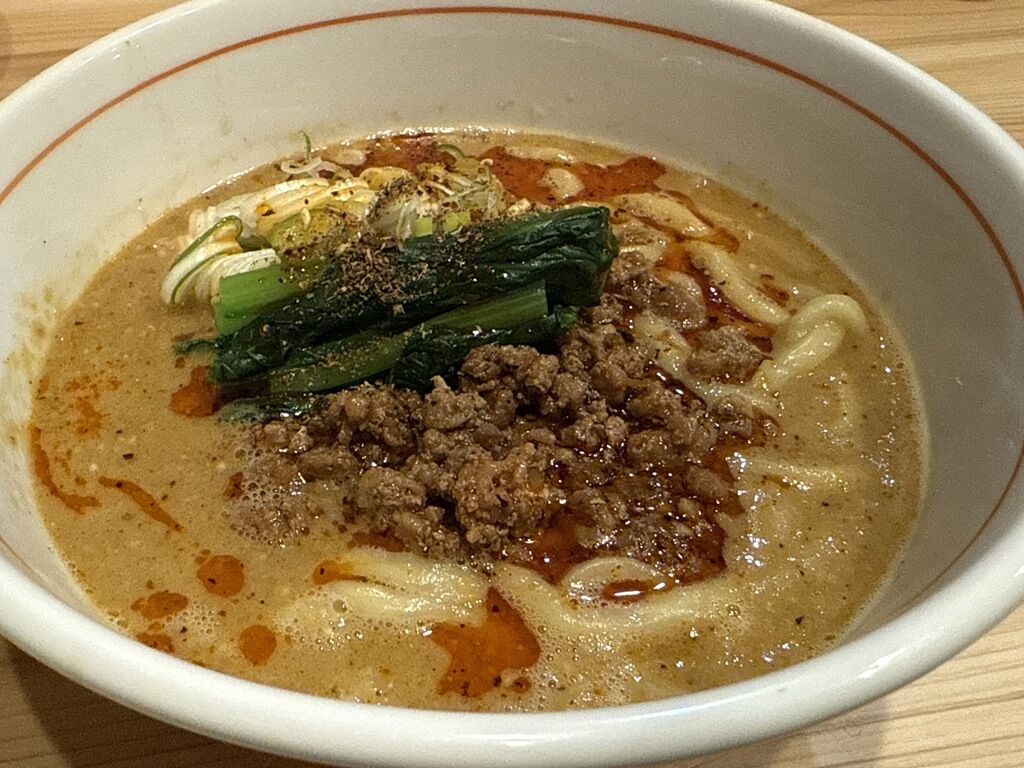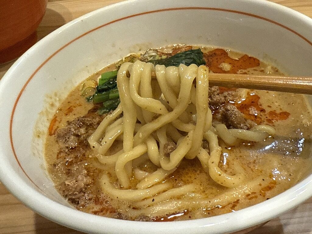 麺はほぼストレート太麺。中華そばよりも二段階ほど太めじゃないかってくらい、まるでうどんの様なつけ麺にそのまま行けそうな極太さ。麺のコシと風味も同時に存分に楽しめる、類まれな担々麺で、忘れられない一杯になります。