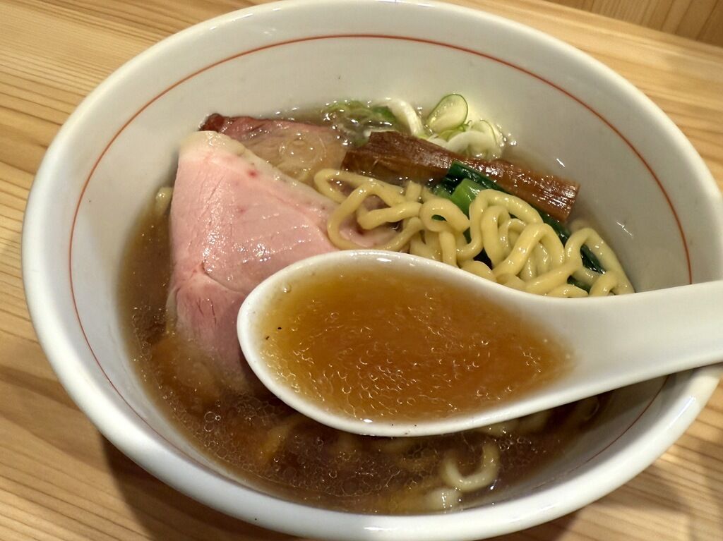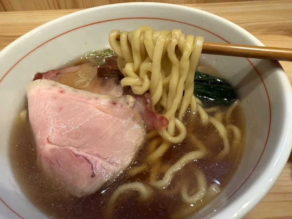 スープはさらさらの無化調清湯醤油味。煮干しと鰹節の出汁。ふんわりと包み込まれる様な煮干しで、確かに「もつけ」に近いテイスト。最初はあっさりに感じますが、どんどん煮干しレベルがアップして、後半はすごいニボニボ感に。徹頭徹尾ほっこりながら、煮干しが濃く強く太く大きく効いていてすごく美味しい!