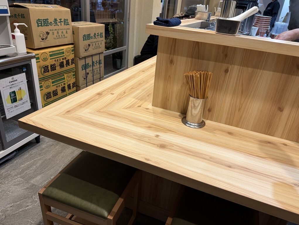 BGMはポップス。箸は洗い箸でサスティナブルに配慮。卓上調味料は無し。
