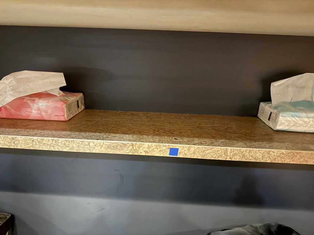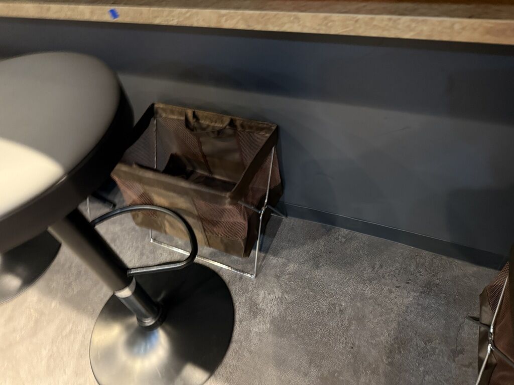 紙エプロンは券売機横からセルフで。カウンター下の棚に箱ティッシュ、カウンター足元に荷物かごの用意あり。