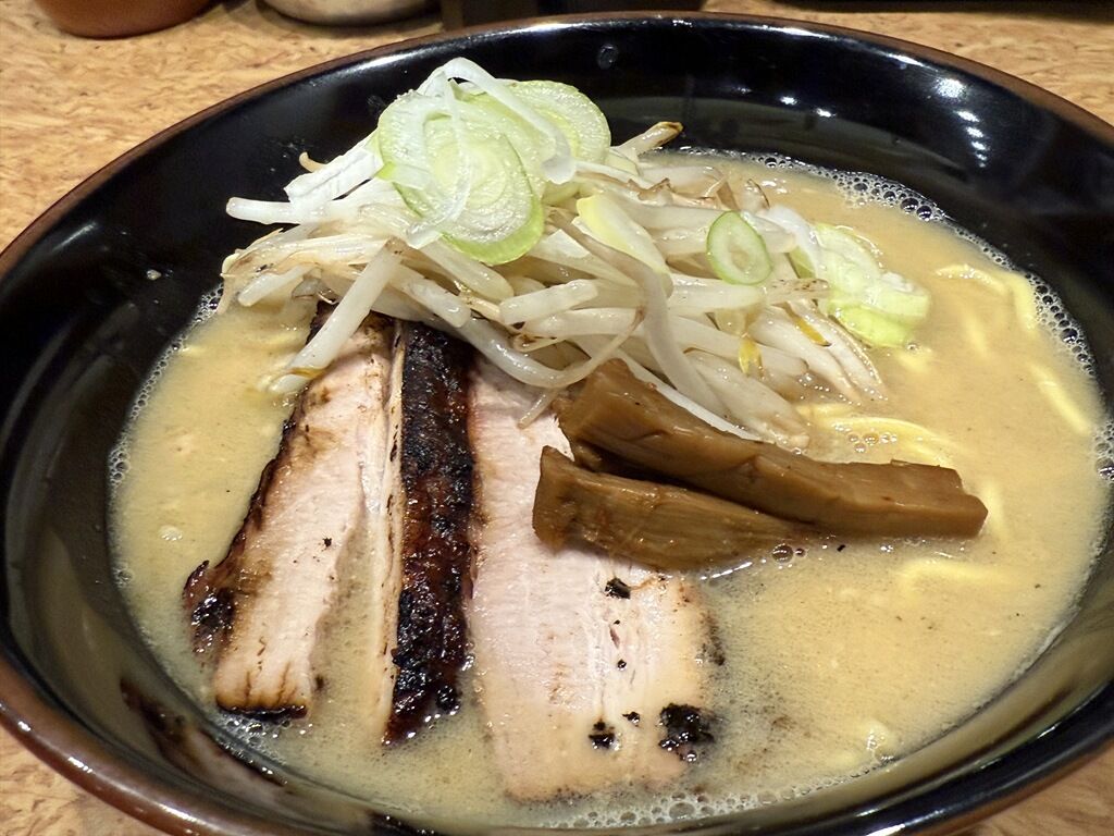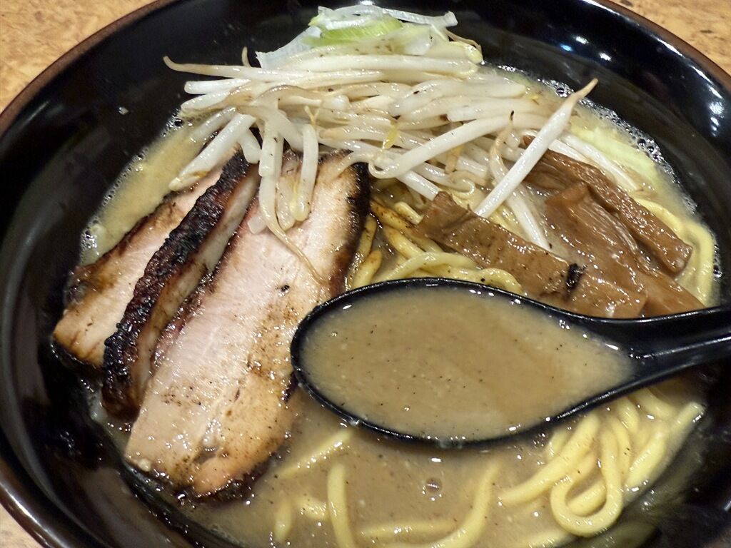 スープはとろっと濃厚な豚骨味噌味。中華鍋で炒め煮して仕上げたスープは熱々で香ばしく、風味絶佳旨み炸裂!花道庵→味噌っこふっくと名店の系譜をまざまざと感じさせるハイレベルな一杯ですごく美味しい!