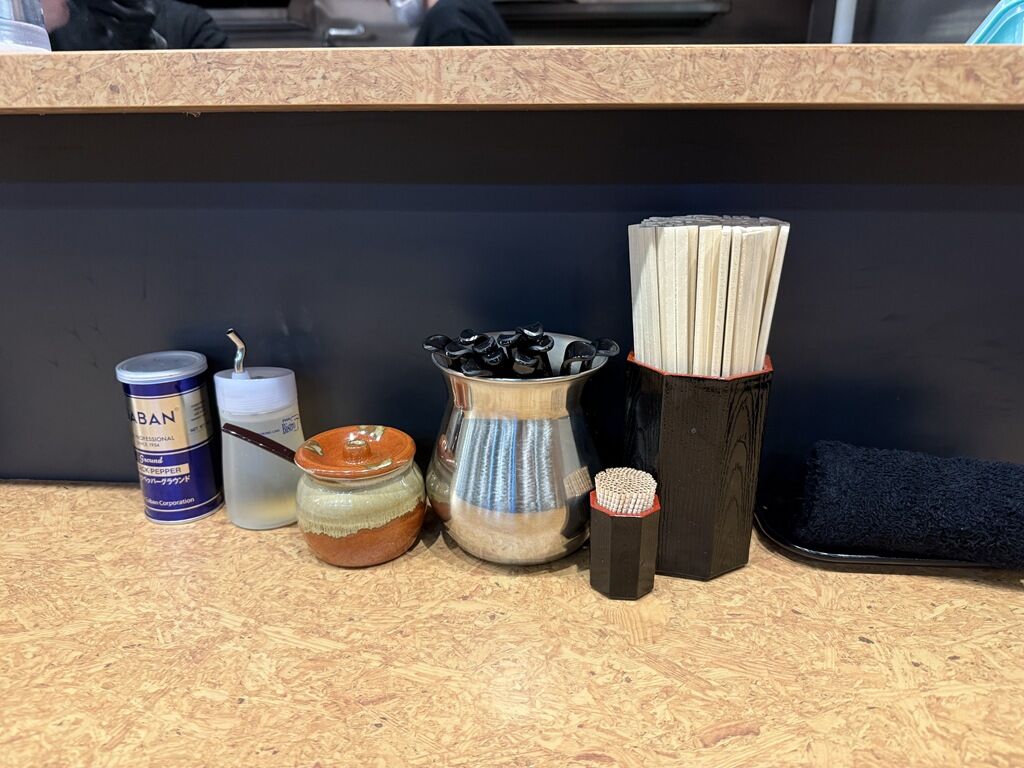 BGMはジャズ。箸は割り箸。卓上調味料はGABANブラックペッパー、酥、一味唐辛子。