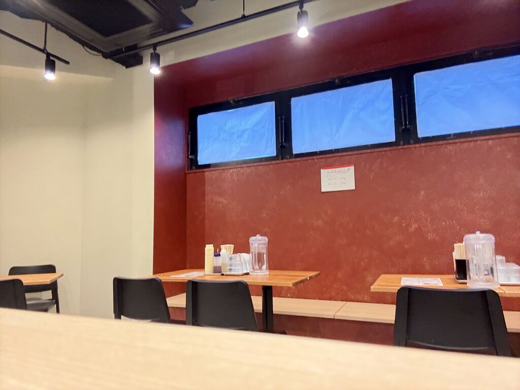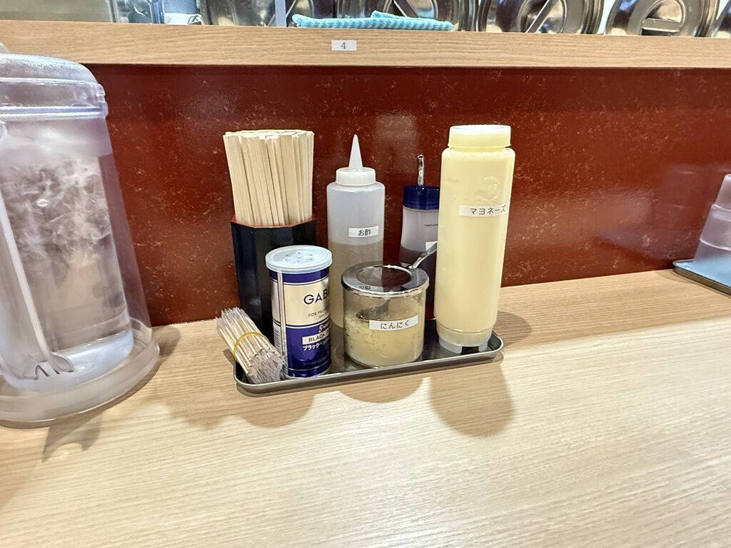 BGMはJ-POP。箸は割り箸。卓上調味料は酢、ラー油、GABANブラックペッパー、にんにく、マヨネーズ。