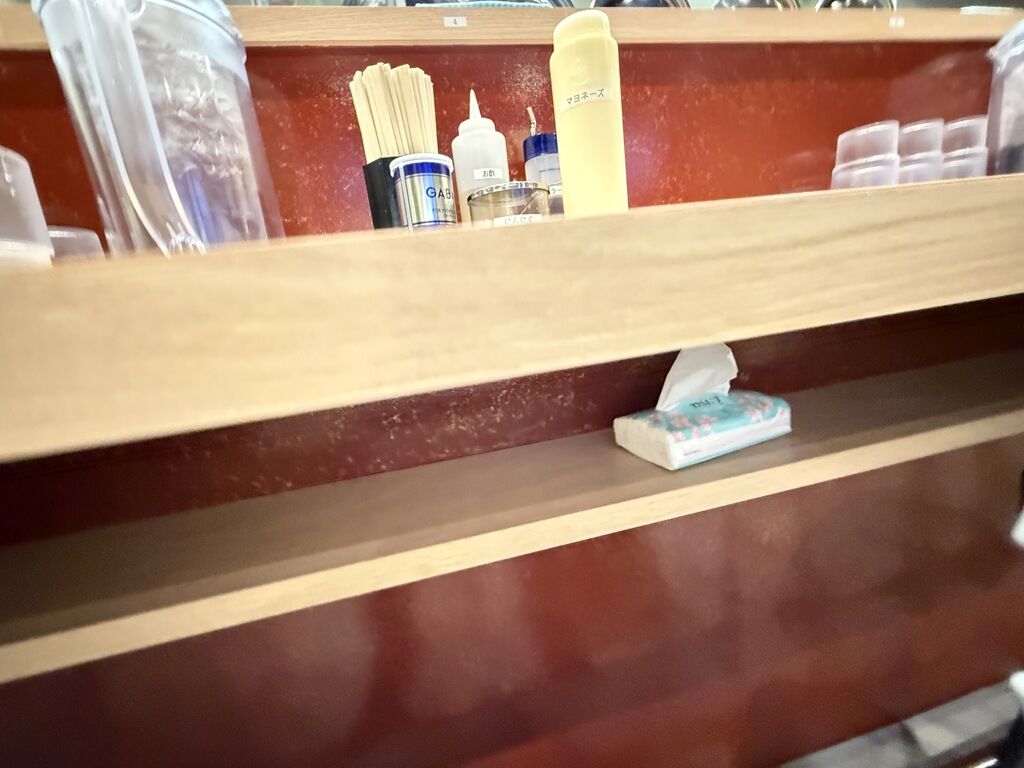 18:30頃到着で先客1、後客無し。スタッフは店主さん含め男性3女性1。荷物かごは出して貰いました。紙エプロンは申告制。カウンター下に箱ティッシュあり。