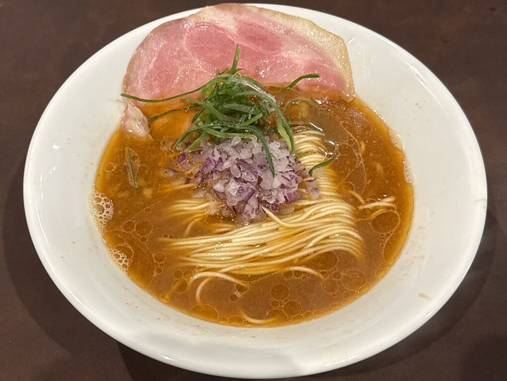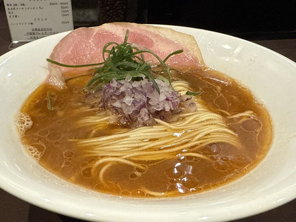 具は低温調理のチャーシュー、細切り青ねぎ、きざみアーリーレッド。チャーシューが縁から向こうに垂れ下がってれば、ペロンチャーシュー認定でしたが惜しい!