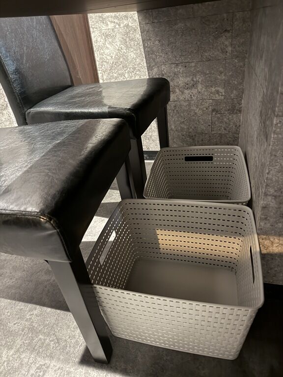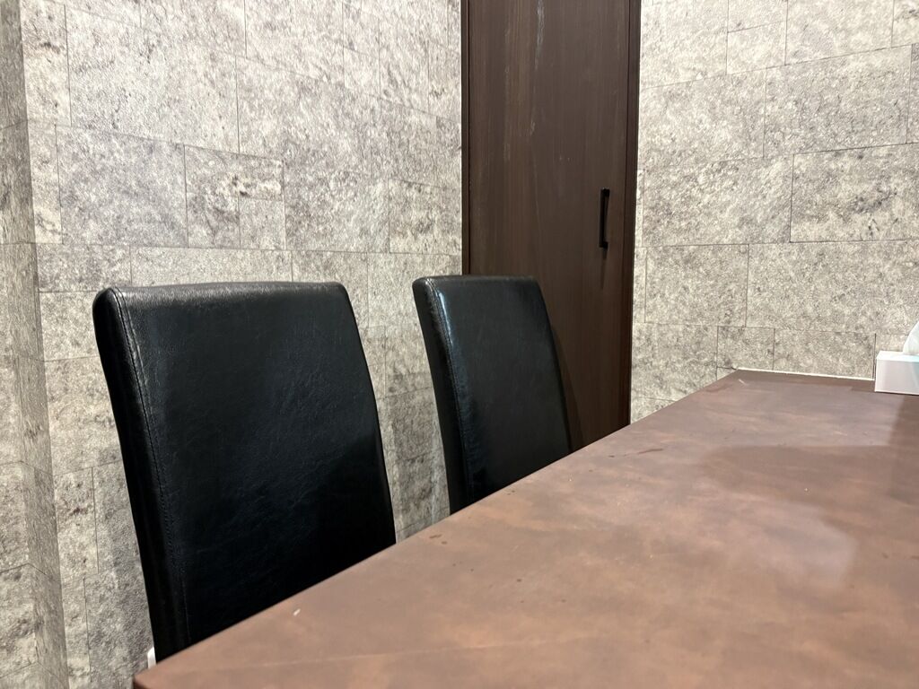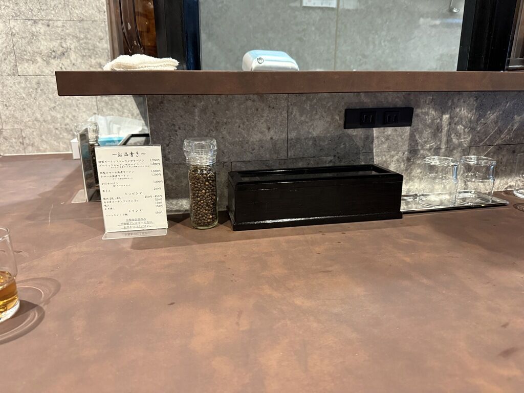 BGMはポップス。箸は洗い箸でサスティナブルに配慮。ピッチャーにはお冷代わりの冷たい麦茶。卓上調味料はミル入りブラックペッパー。