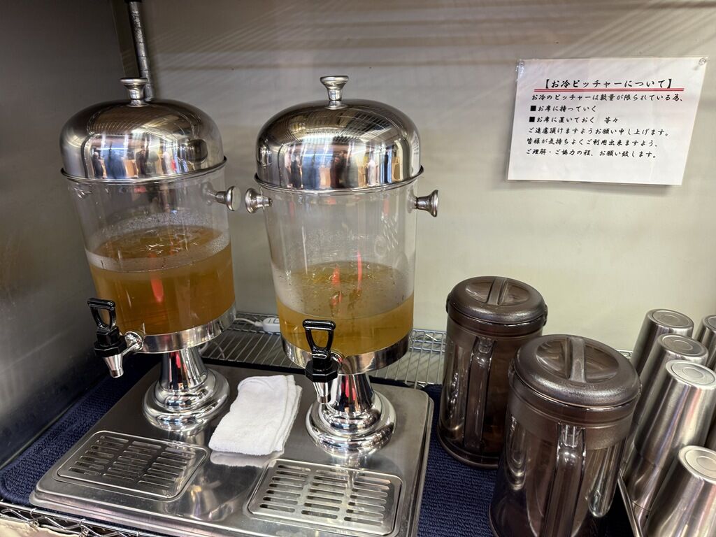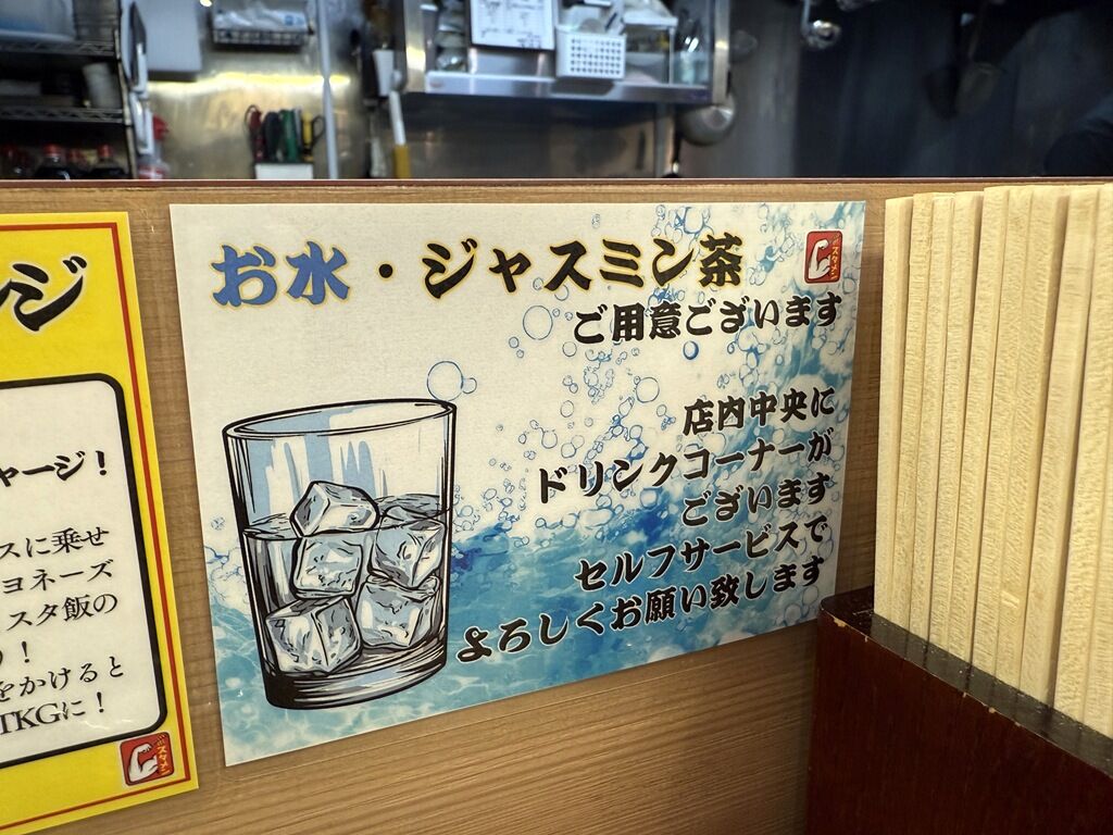 お冷やはセルフで店内中央ドリンクコーナーに、冷たいジャスミン茶or冷水。