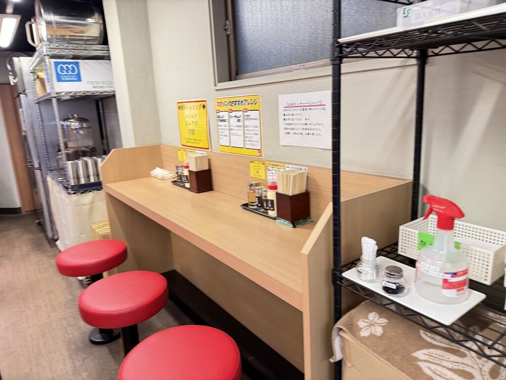 BGMはJ-POP、ハルジオン、それを愛と呼ぶなら、他♪箸は割り箸。卓上調味料は酢、一味唐辛子、黒胡椒、マヨネーズ。