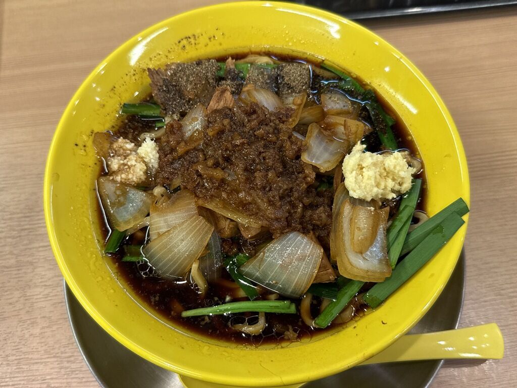 具はサイコロチャーシュー、玉ねぎ、ニラ、無料トッピングのニンニク、ショウガ、味付け背脂。