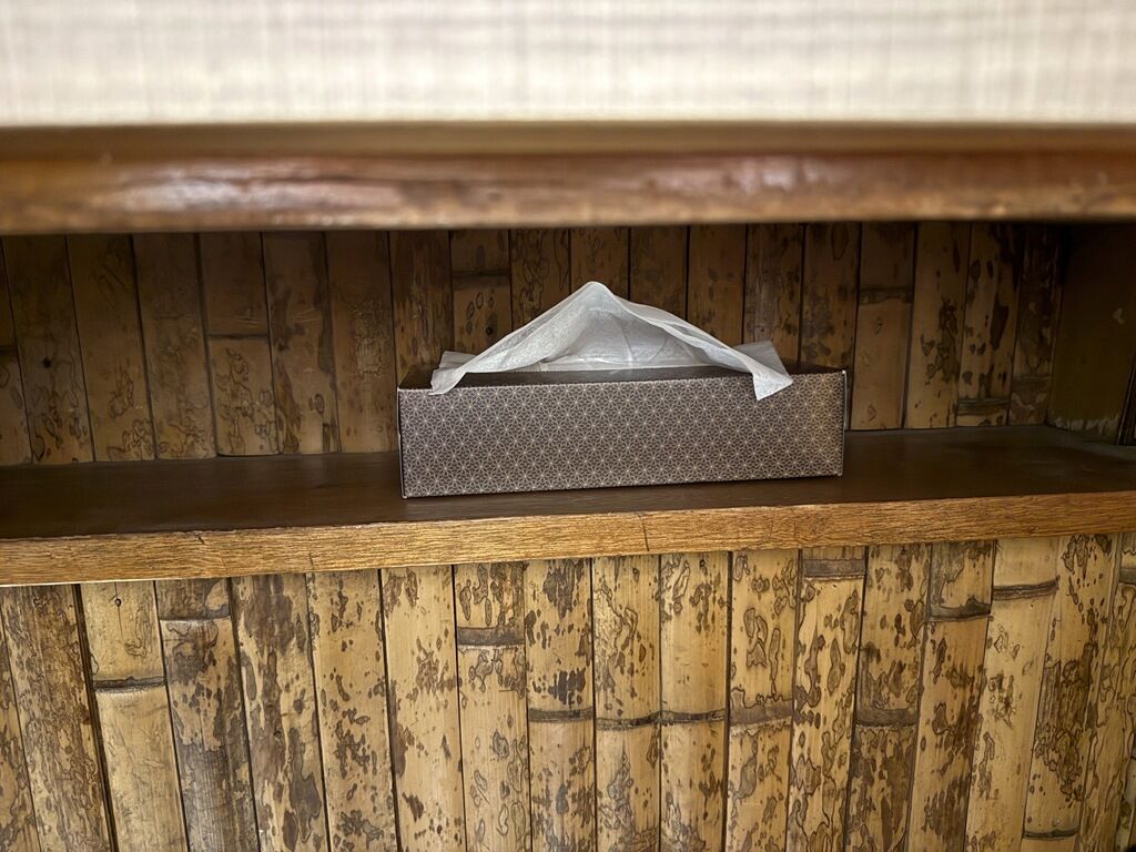後客4。スタッフは調理と接客の男性2。箱ティッシュはカウンター下の棚に。紙エプロンは申告制。