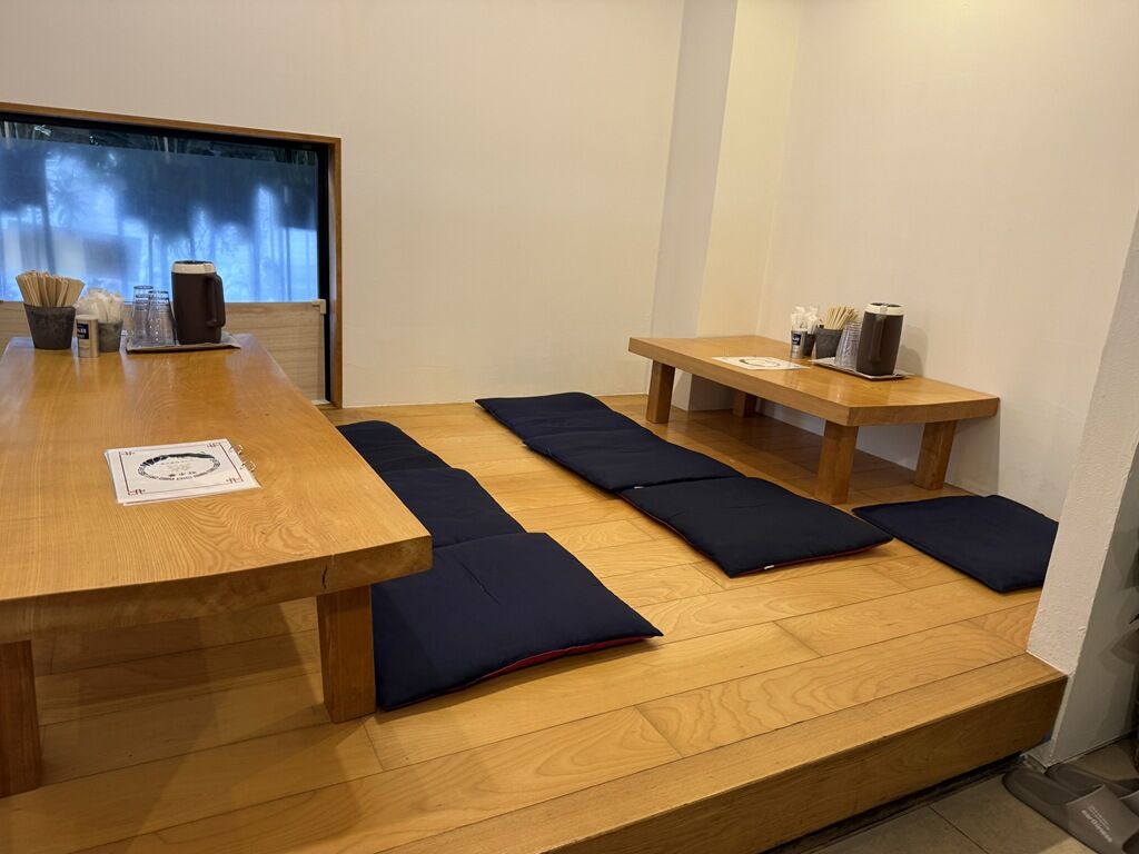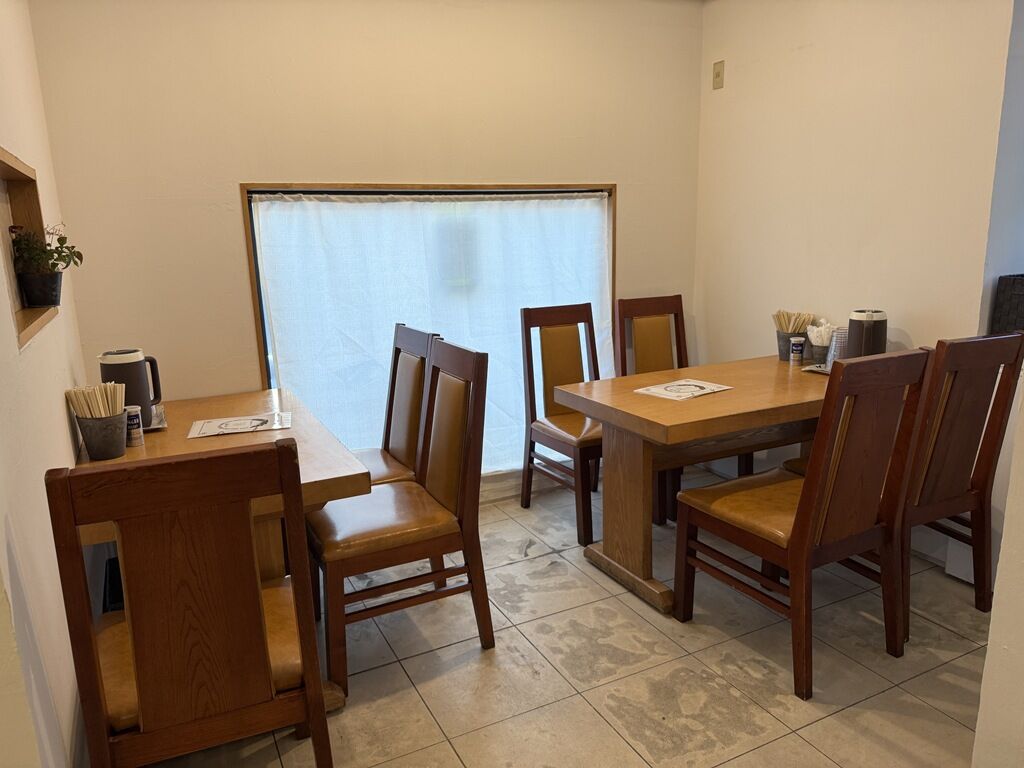 店内は厨房前に真っ直ぐなカウンター4席、4人卓x2。小上がりに6人卓と4人卓。