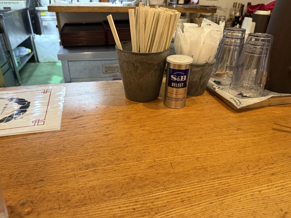 BGMはポップス。箸は割り箸。卓上調味料はS&Bブラックペッパー。