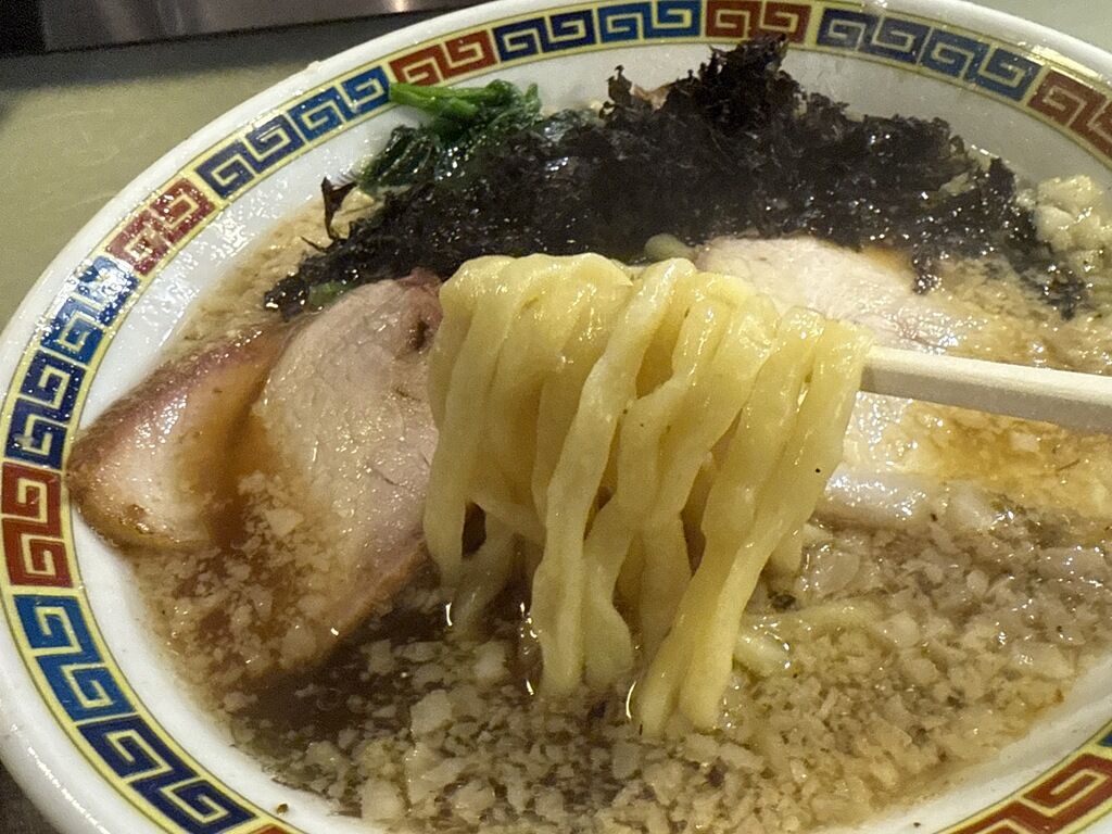 三河屋製麵製の麺は太縮れタイプ。大釜で泳がせるてゆでて平ざるで麺上げ。かなり固めのゆで加減でワシワシとほおばる感覚。スープが軽めのためやや麺が強い印象。
