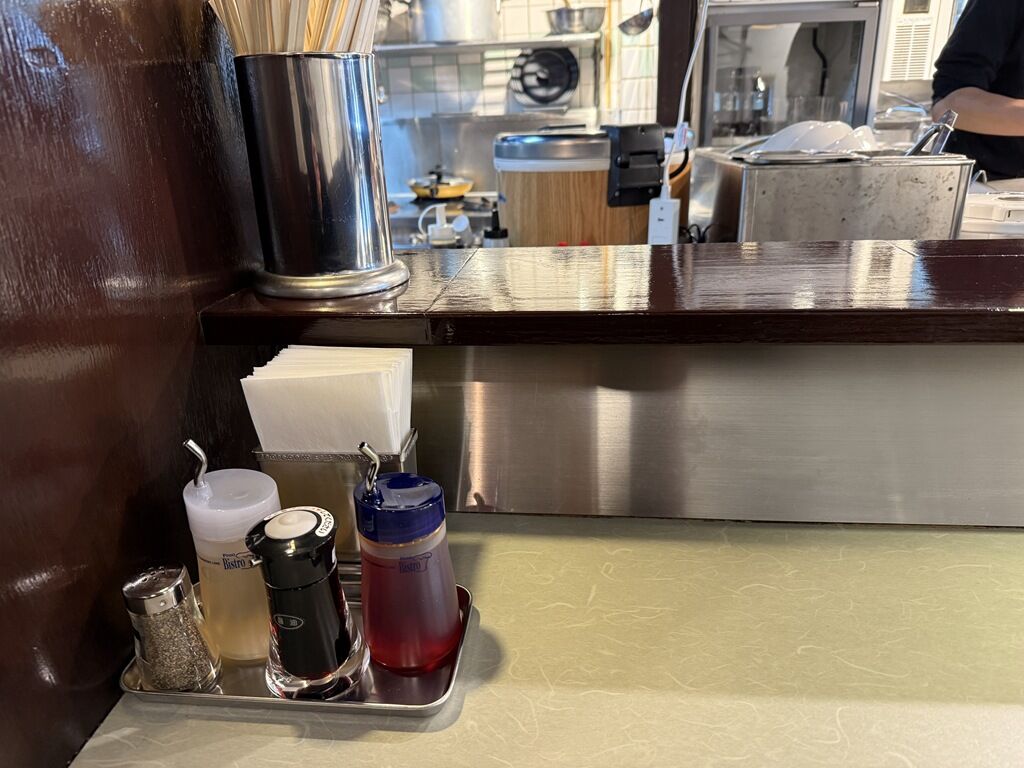 箸は割り箸。卓上調味料はブラックペッパー、酢、醤油、ラー油。