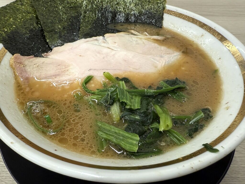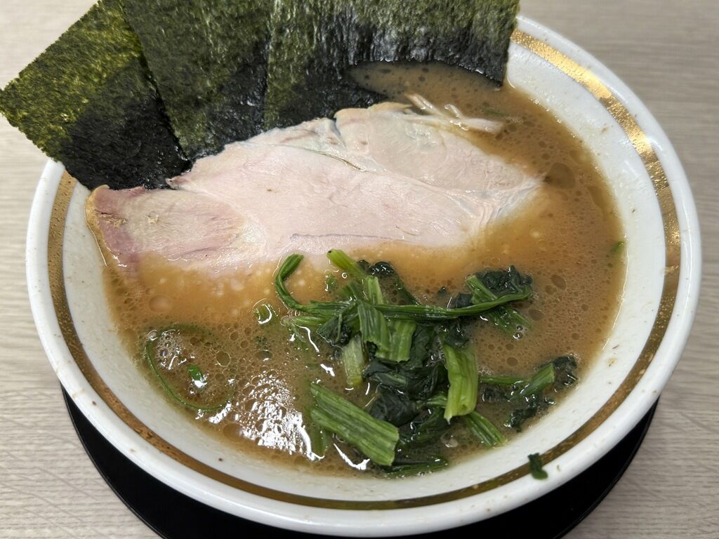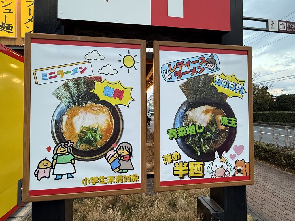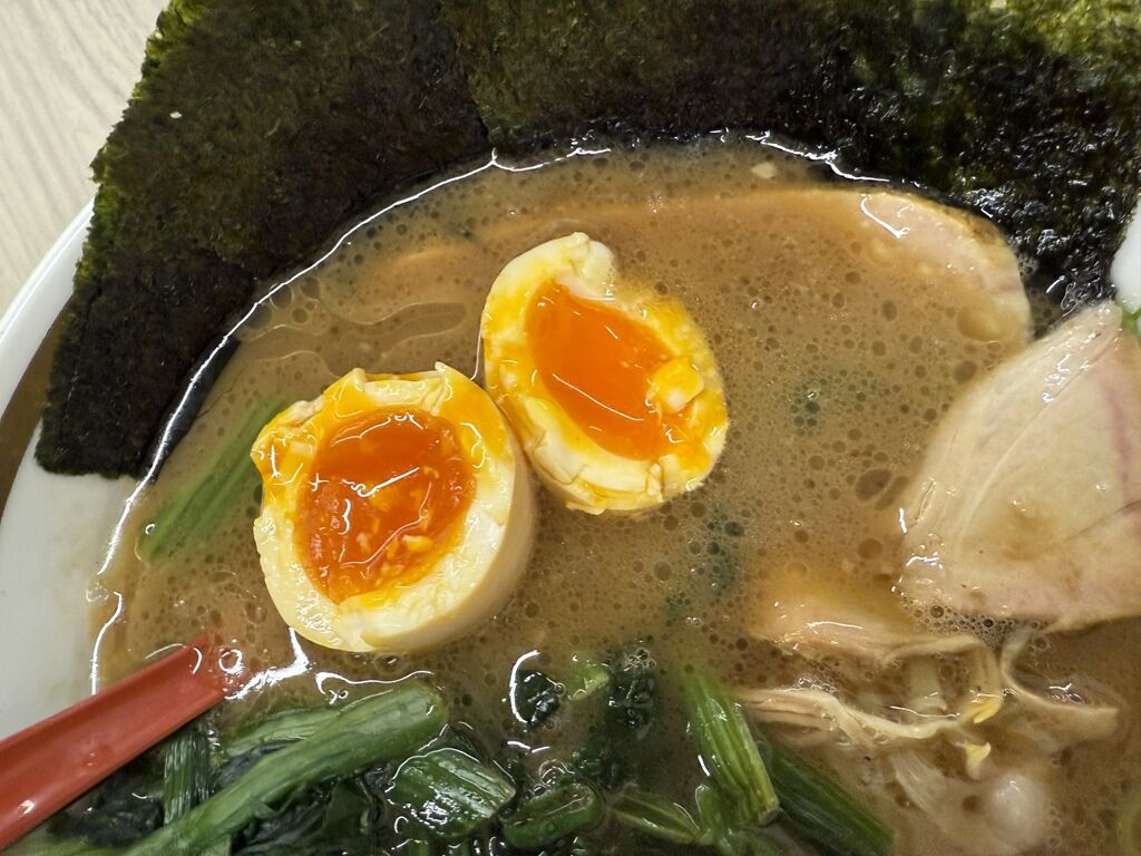 レディースラーメンは、麺量半分で味薄め味玉付きほうれん草増量。