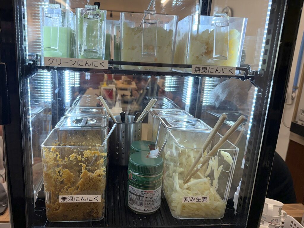 冷蔵ショーケースにOhot 粗挽きトウガラシ、無限にんにく、刻みしょうが、グリーンにんにく、無臭にんにくあり。