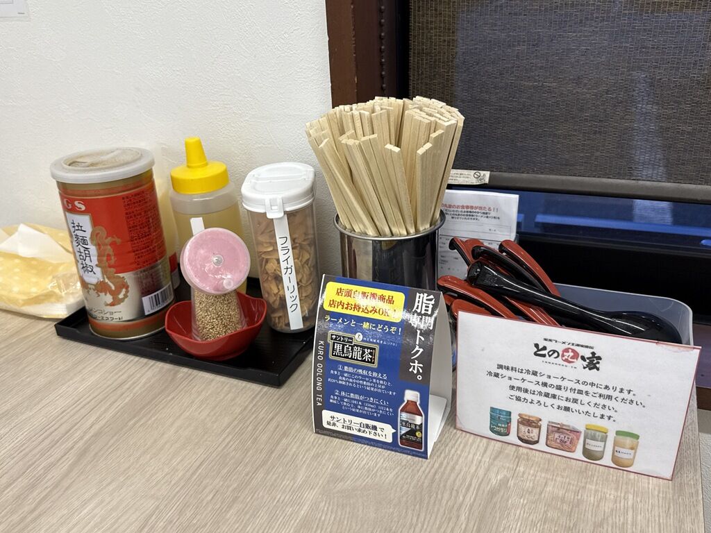 箸は割り箸。卓上調味料はGS拉麺胡椒、ラーメン酢、すり胡麻、フライドガーリック、マヨネーズ。