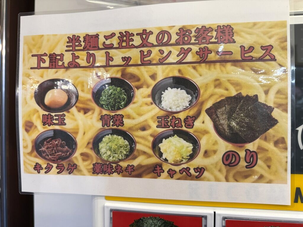 半麺注文で味玉、青菜、玉ねぎ、きくらげ、薬味ネギ、キャベツ、海苔のいずれかサービス。