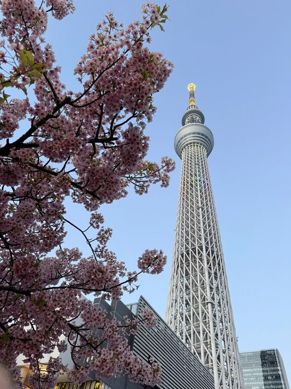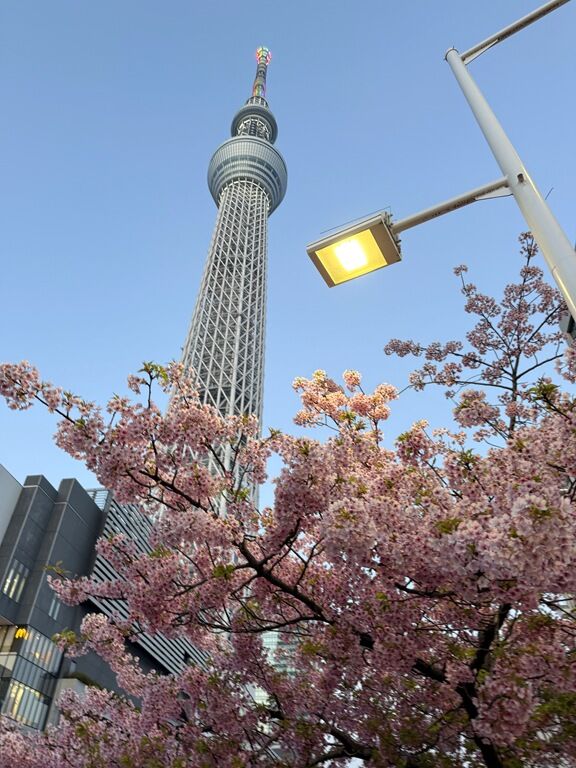 とうきょうスカイツリー駅近く東武橋のたもとでは、早咲きの河津桜とスカイツリーのコラボが楽しめます。
