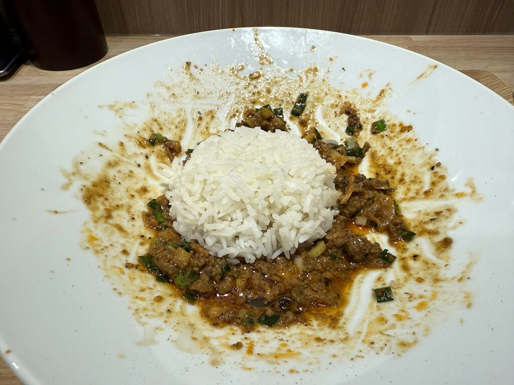 そして待つことしばし「汁なし担々麺+ミニジャスミンライス」完成で〜す♪