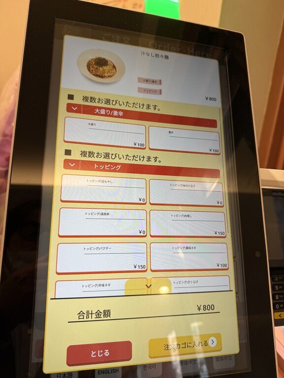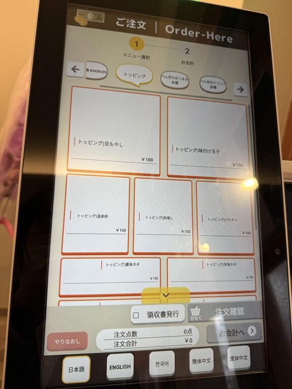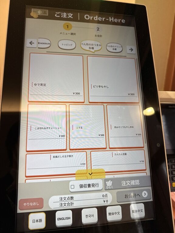 トッピング豆もやし、温玉、味玉無料サービス、券売機で選ぶ方式、多分プレオープンサービス。