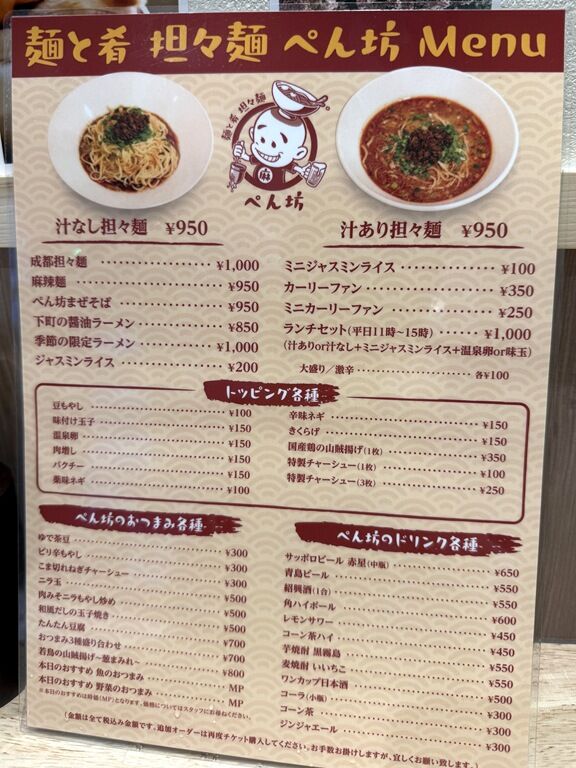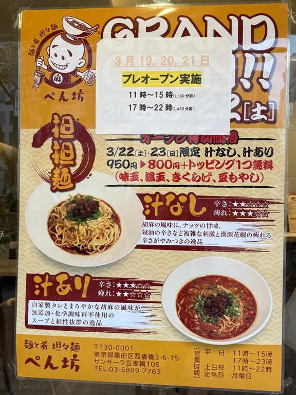 2025年3月21日、本所吾妻橋の新店「担々麺 ぺん坊」へ。