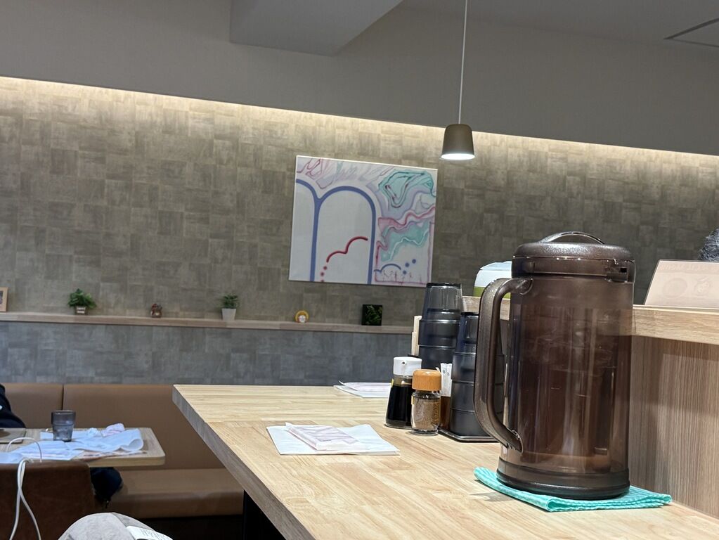 BGMはポップス。箸は洗い箸でサスティナブルに配慮。卓上調味料は黒酢、山椒。