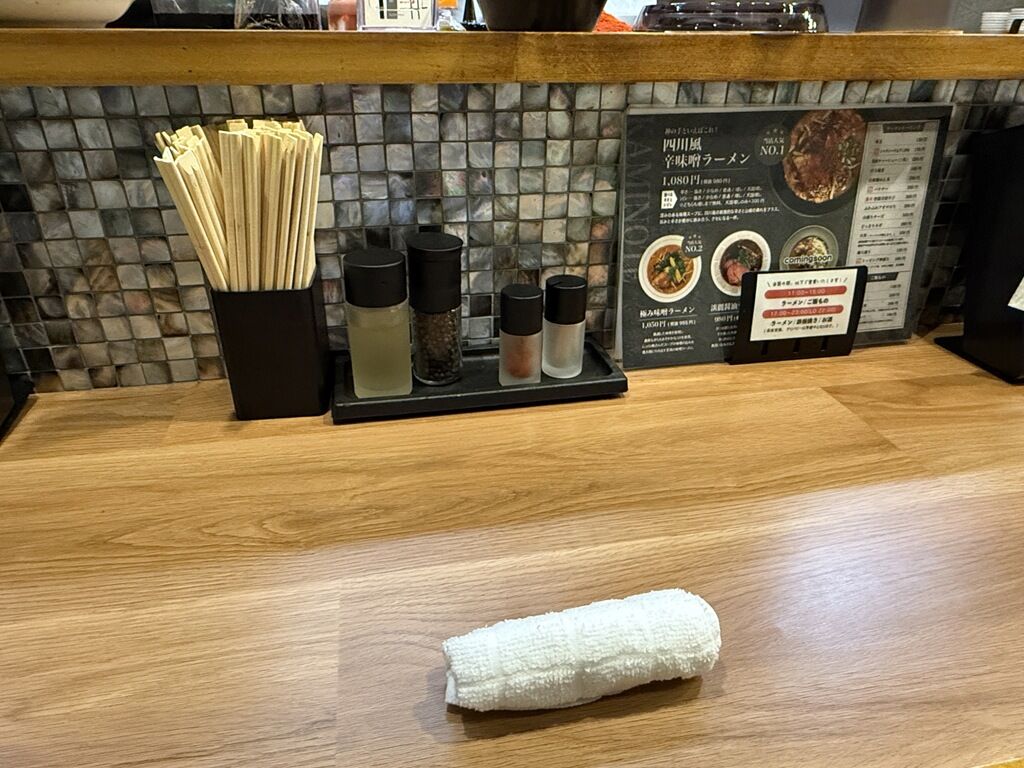 BGMはポップス。箸は割り箸。卓上調味料は酢、ミル入りブラックペッパー、一味唐辛子。
