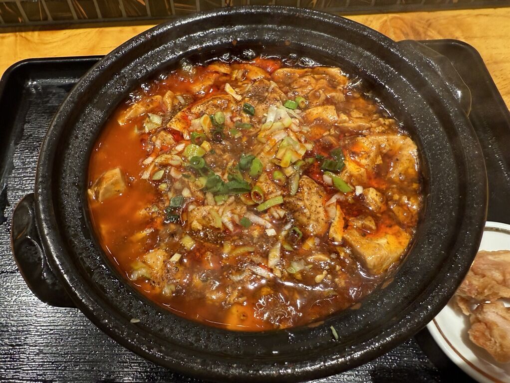 ぐつぐつ煮えたぎる麻婆豆腐が入った土鍋が、鍋敷に乗ってトレーごと着丼。