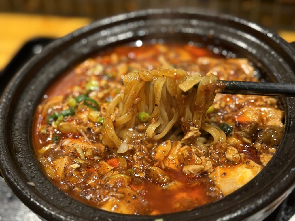 麺は平打ちのほぼストレート中太タイプ。土鍋に麺を入れて上から麻婆豆腐をかけて鍋を加熱したのか、麺が鍋底にびっしり焦げついた状態に。麺のどこを引っ張っても、麺の下の方が鍋にくっ付いてるため、まず麺を鍋底から剥がす作業から。ただ、焦げ臭や焦げた嫌な苦味、灰汁っぽさ、あたってる感は全くなく、焦げた麺がカリッとパリッと香ばしく実に美味しい!