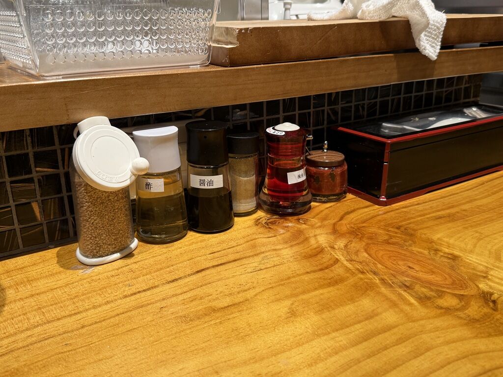 BGMはピアノムードミュージック♪箸は洗い箸でサスティナブルに配慮。卓上調味料は擦り胡麻。酢、醤油、白胡椒、ラー油、辛味調味料。
