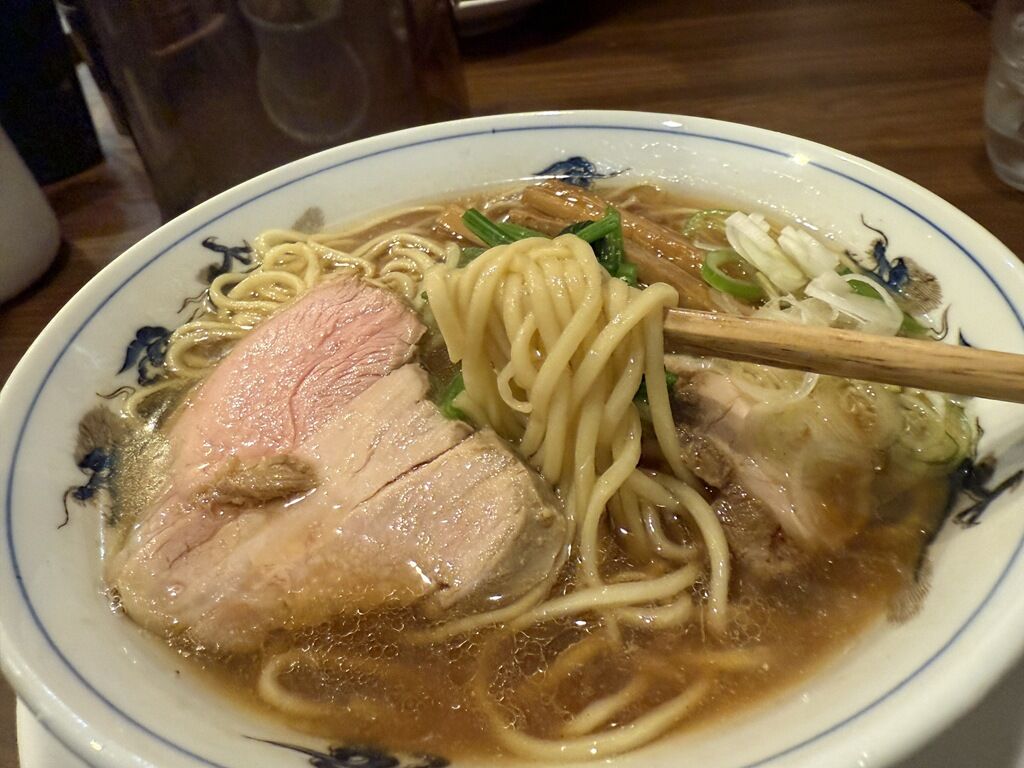 スープはさらさらの清湯醬油味。熱々での提供。煮干くっきり、香味油が香ばしく層を成して、味は異なりますが春木屋とか永福系を想起させるベクトル。こくまろでうま味たっぷり、どこか懐かしくてでも新しいネオノスな味わい。いきなりのハイレベルさに一同賞賛でとっても美味しい!