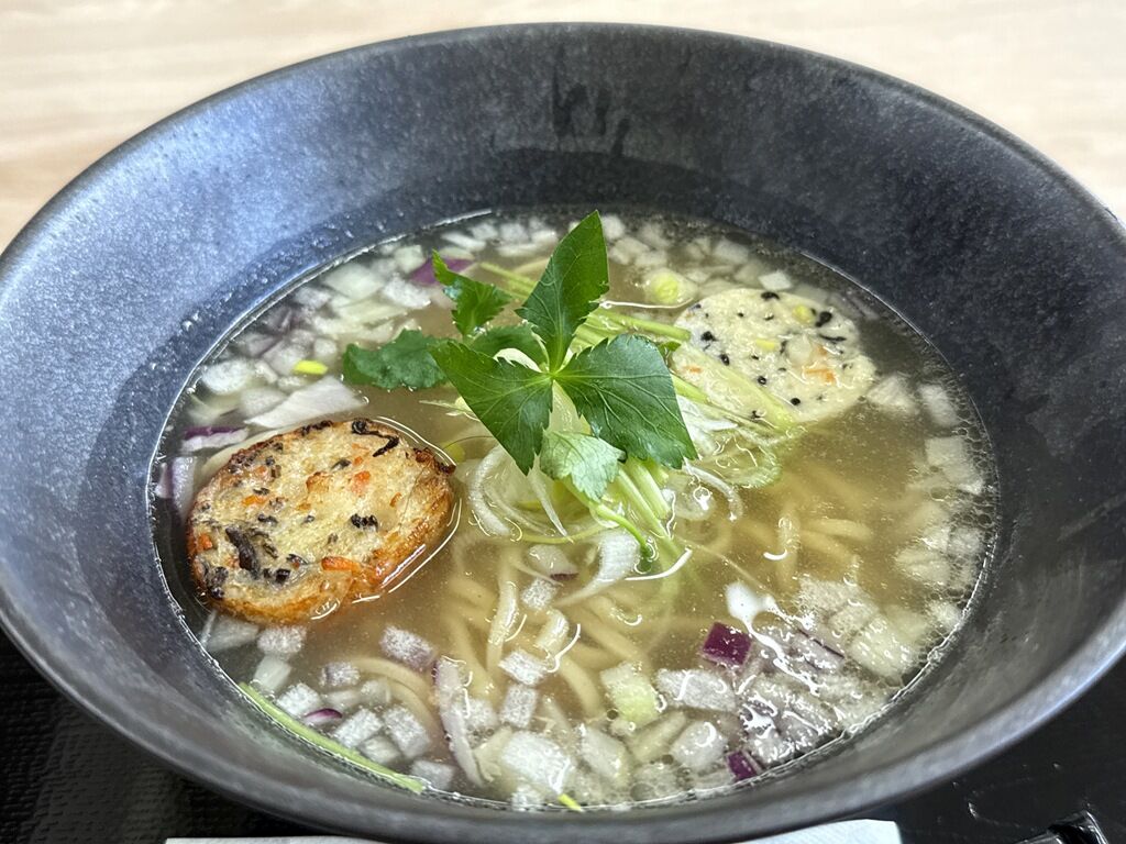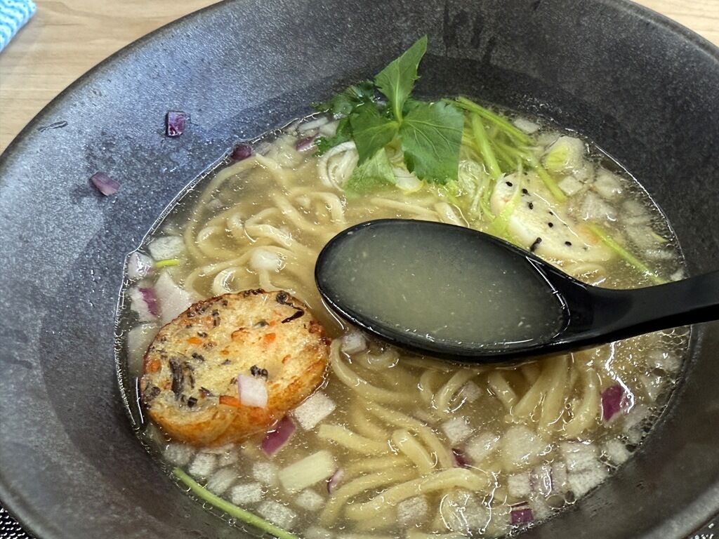 スープはさらさらの清湯塩味。アラを炊いたまさにアラ汁、潮汁といった、一口目から鮮魚出汁とはっきり分かる、あっさりながら魚のうま味ある味わい。海の恵み、ミネラルと自然な甘味と旨みがあってとても美味しい!