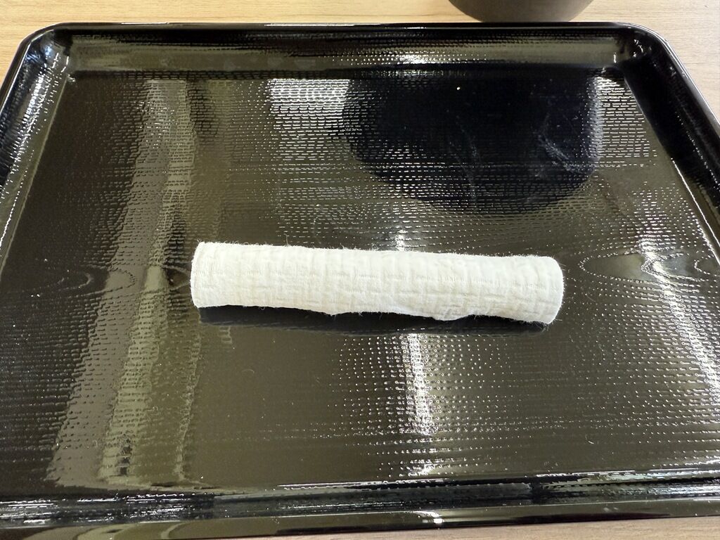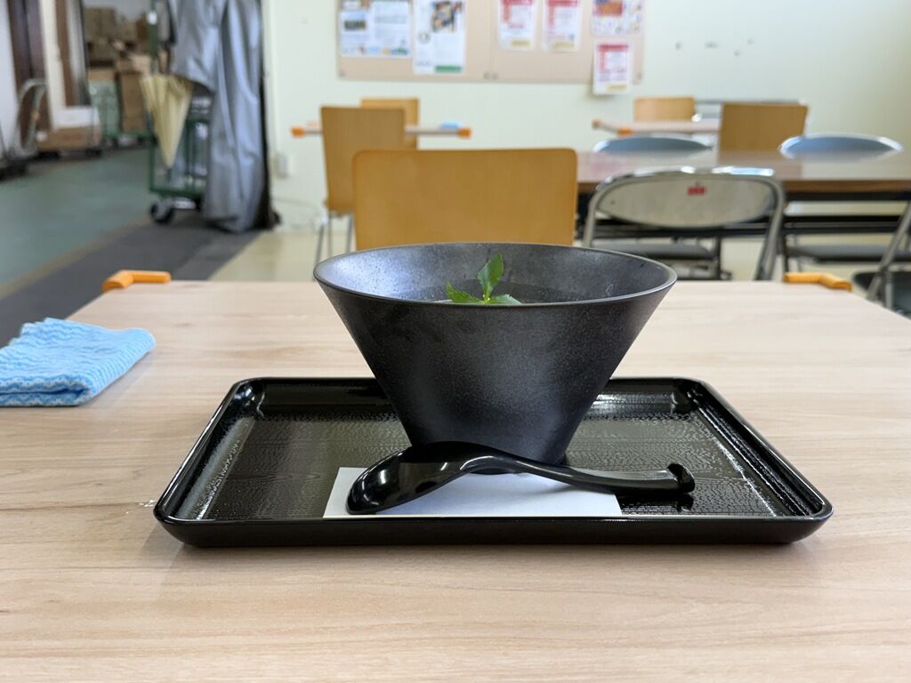 艶消しブラックの切立丼が、ペーパーナプキン、レンゲ、割り箸と共にトレーに載って着丼。