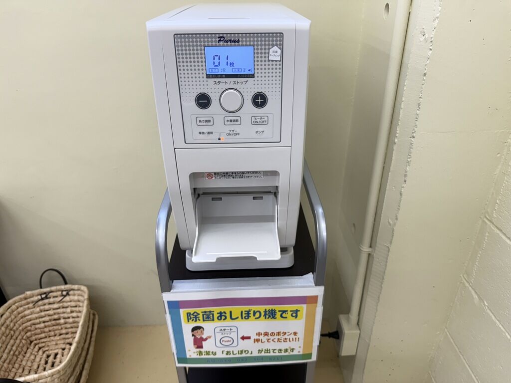 珍しい「除菌おしぼり機」が設置されていて、無料でウェットティッシュが出てきます。