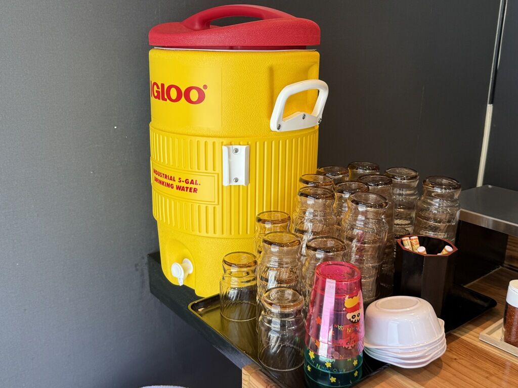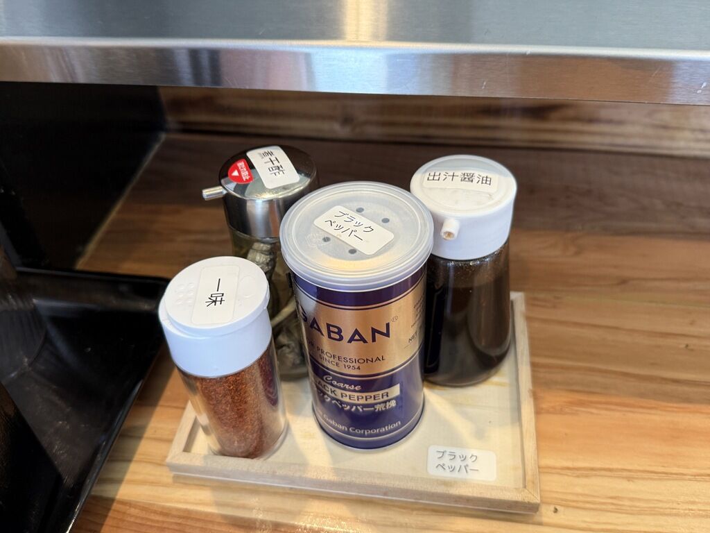 BGMはFM NACK5。箸は洗い箸でサスティナブルに配慮。卓上調味料は一味唐辛子、煮干酢、GABANブラックペッパー、出汁醤油。