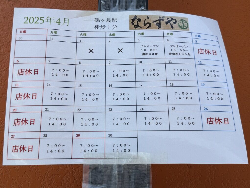 2025年4月12日、鶴ヶ島の新店「らぁ麺 ならずや」へ。
