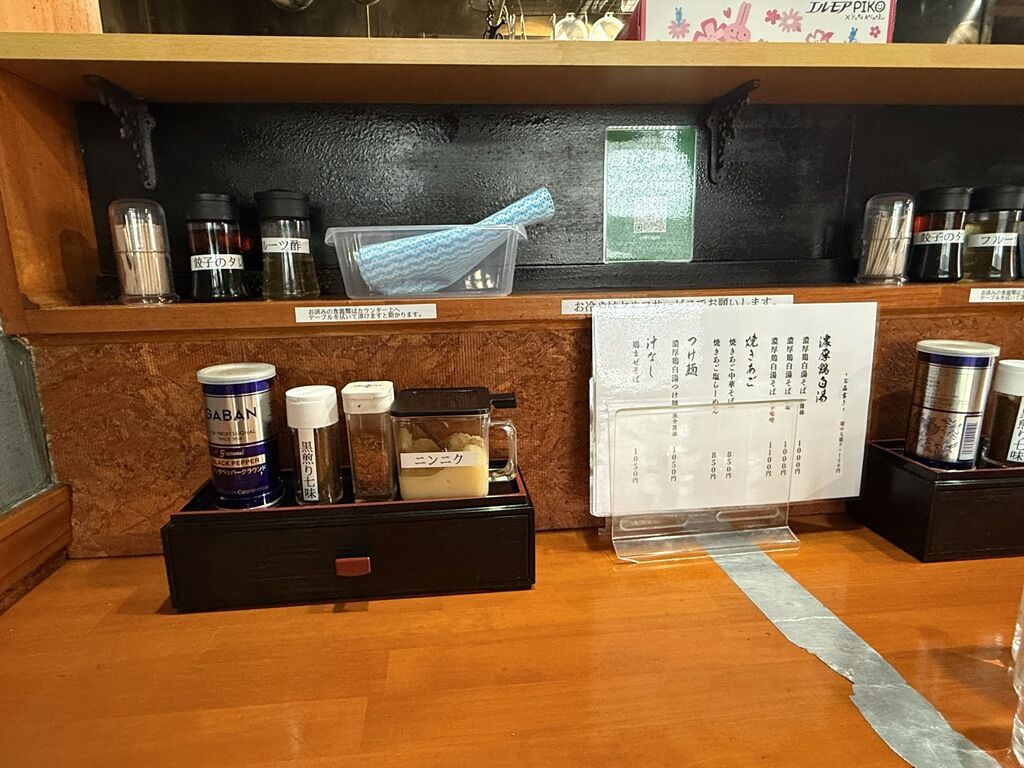 BGMはJ-POP。箸は割り箸。卓上調味料は、GABANブラックペッパー、黒煎り七味、七味唐辛子、おろしニンニク、自家製餃子のタレ(酢、リンゴ、レモン)、フルーツ酢(醤油、辣油、フルーツ酢)。