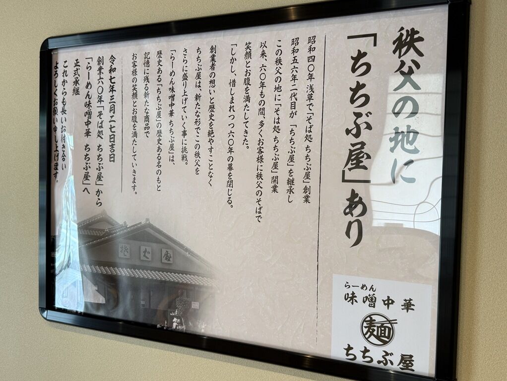 2025年3月27日大安にオープン。60年続いた日本蕎麦の名店「そば処 ちちふ屋」が、2/26で惜しまれつつ閉店。なんと味噌ラーメン専門店に業態変更リニューアル。先日「行田屋」で遭遇した官僚さんのオススメもあり、行ってみることに。