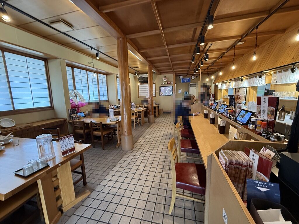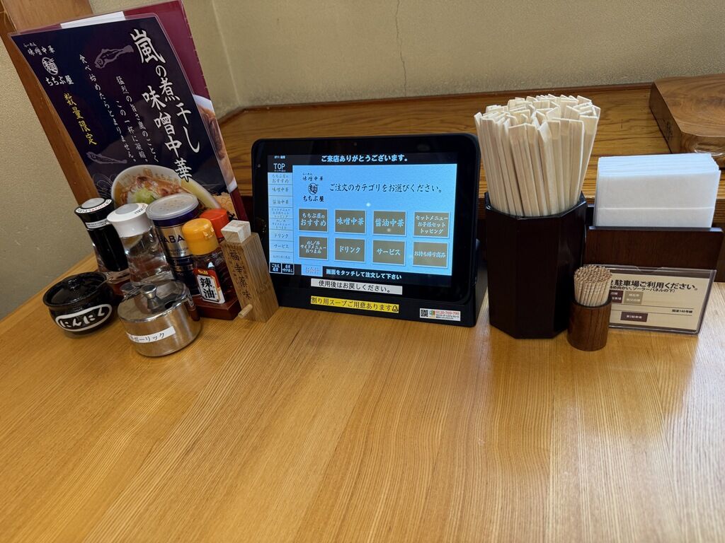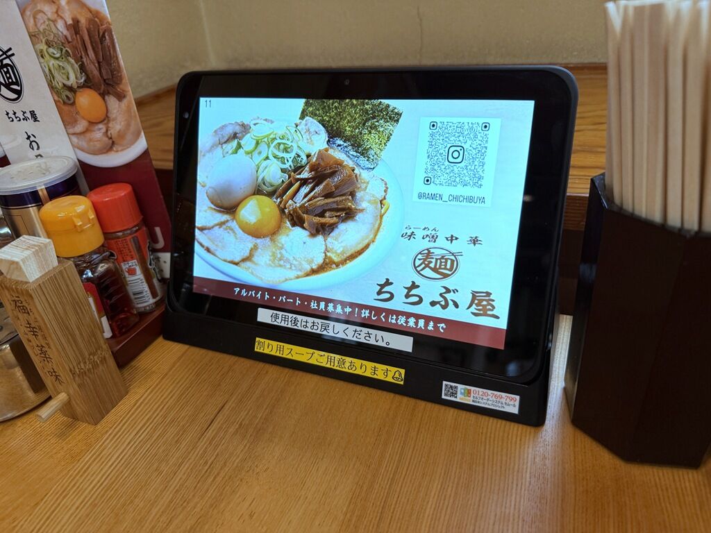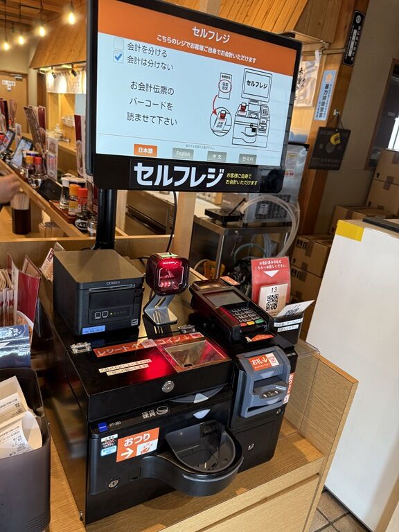 券売機は無く、各席に設置されたタブレット端末で注文。席ごとのQRコードが発券されるので、食後セルフレジにて後会計制。