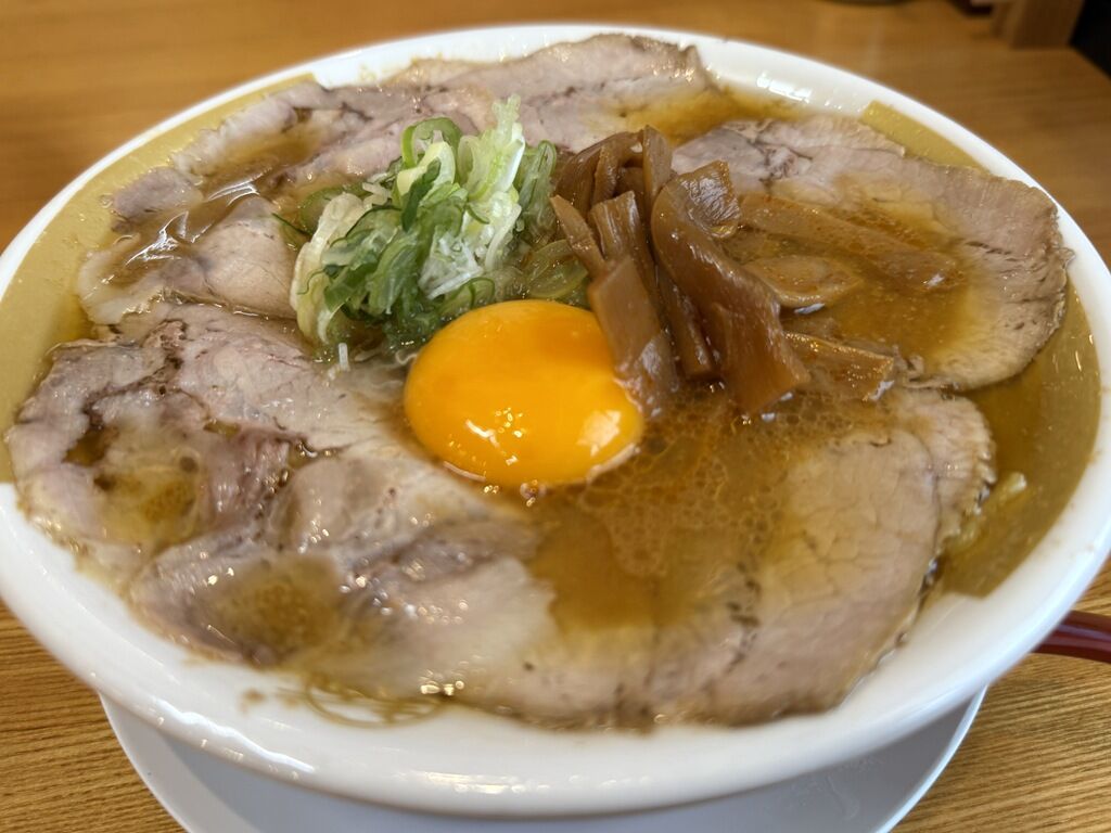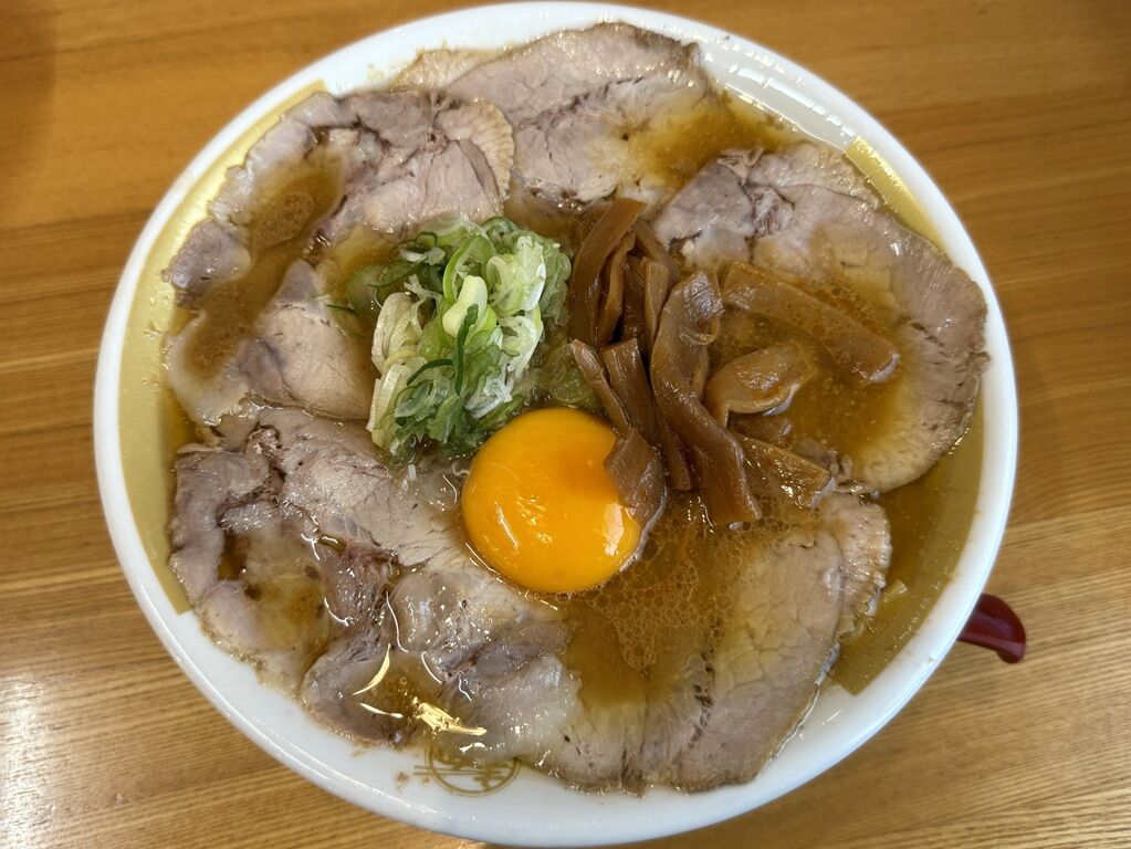 具は丼を覆い尽くすたっぷりのチャーシュー、卵黄、めんま、きざみねぎ。