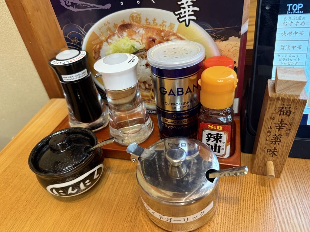BGMはジャズ。箸は割り箸。卓上調味料は醤油、酢、GABANブラックペッパー、S&B辣油・一味唐辛子、ちちぶ屋謹製福幸薬味、おろしニンニク、フライドガーリック。