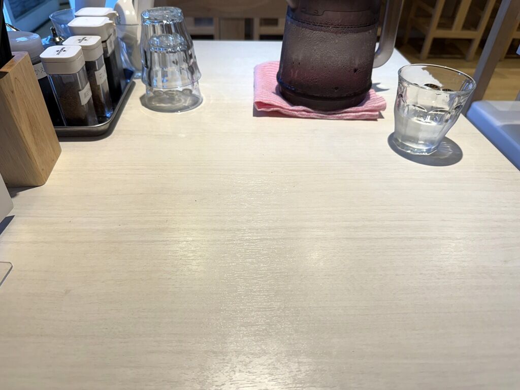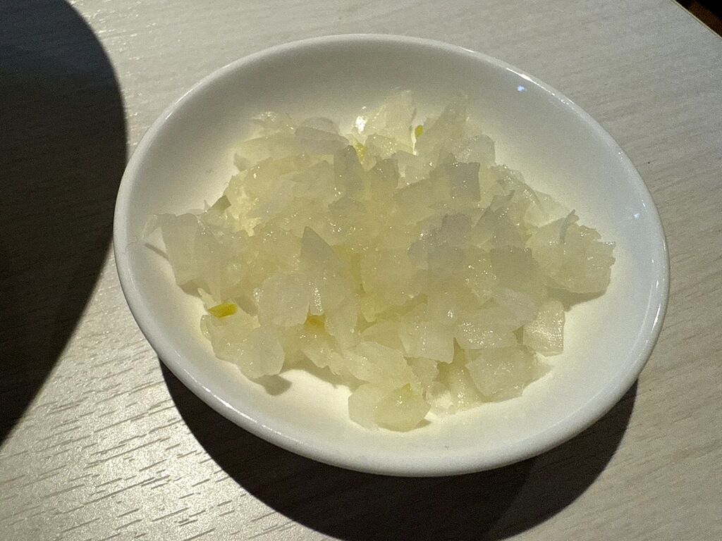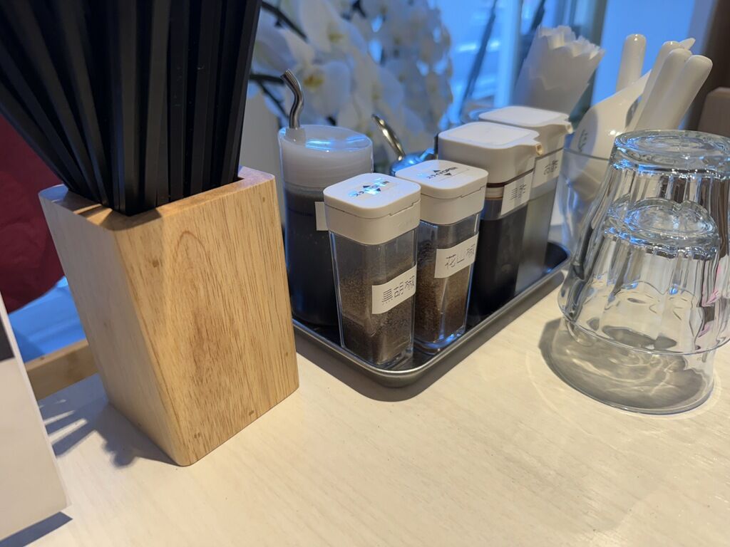 BGMはジャズ。何気にスピーカーの音質がかなりいいです。箸は洗い箸でサスティナブルに配慮。卓上調味料はかえし、ラー油、黒胡椒、花山椒、黒酢、酢。薬味のニンニク、玉ねぎは言って冷蔵庫から出してもらいます。