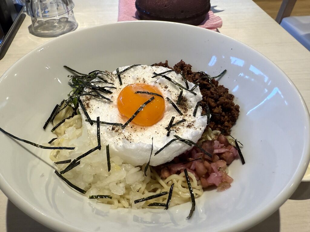 おいしく完食!汁なしトッピングに卵白+ふんわりメレンゲは、自作麺でも応用出来そうです。ごちそうさまでした!