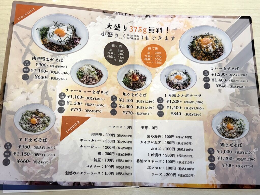 麺量は並盛160g・大盛240g同料金、特盛329g+220円、ハーフ80g-319円。120g・185gも指定可能。