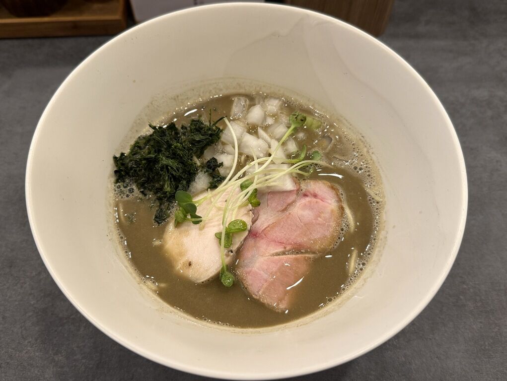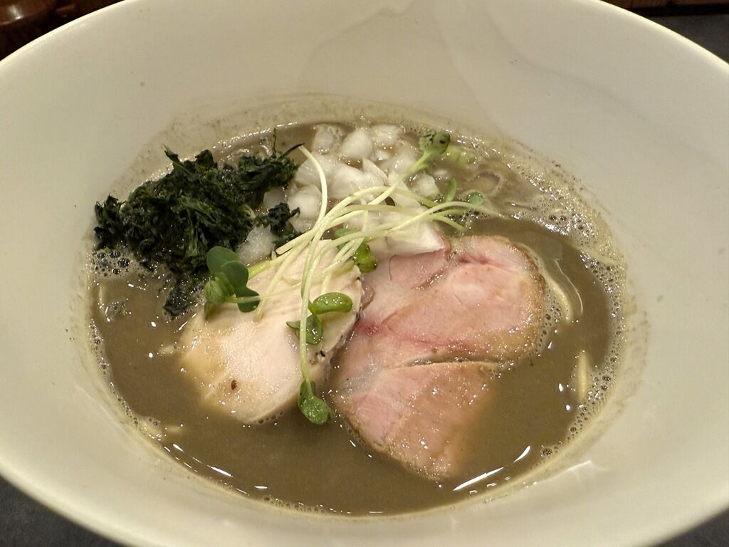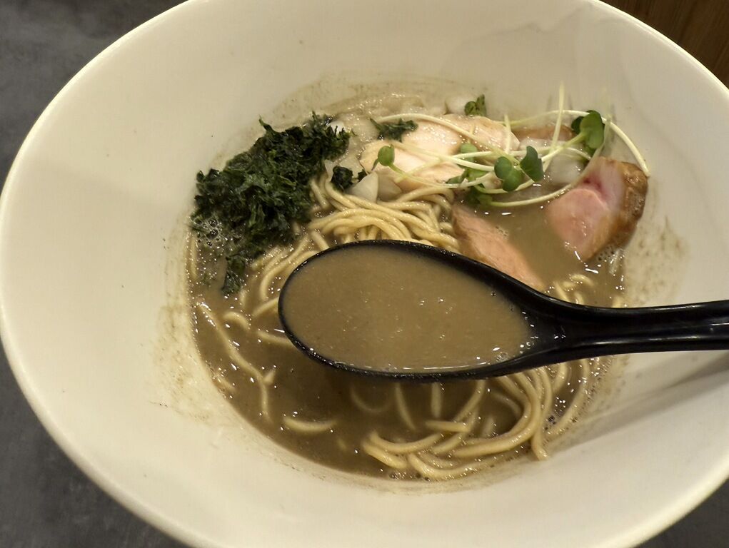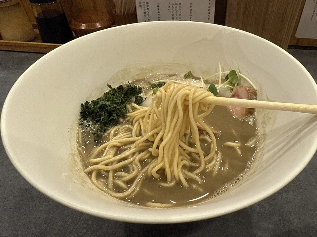 鮮やかなセメントカラーのスープはニボい煮干し醤油味。都内にセメント煮干しのお店はたくさんありますが、こちらもなかなかのニボ度を誇る高煮干濃度な一杯。プリン体豊富で尿酸値高めな方には向いてませんが、味はバッチリ、とっても美味しい!