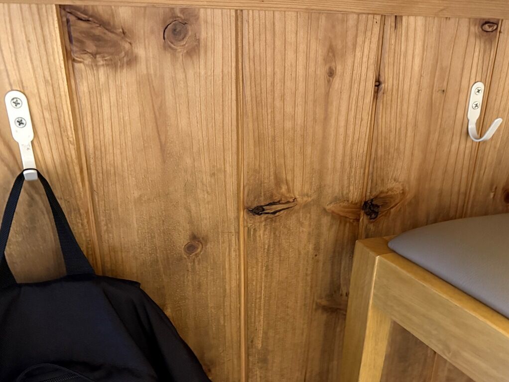 スタッフは厨房に男女合わせて3、カウンターに女子2。カウンター下に荷物フックあり。着席すると置かれるコップの水は、身体に優しい常温水。