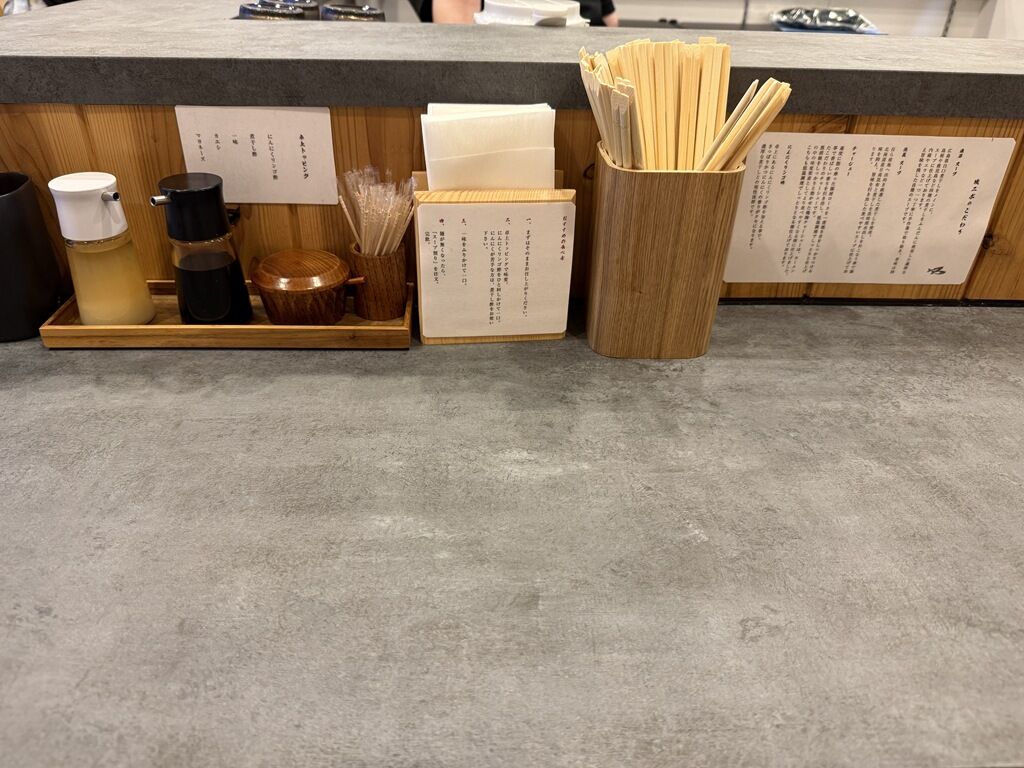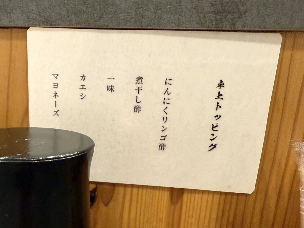 卓上調味料リストには、他に煮干粉、マヨネーズが載ってますが、卓上には無し。